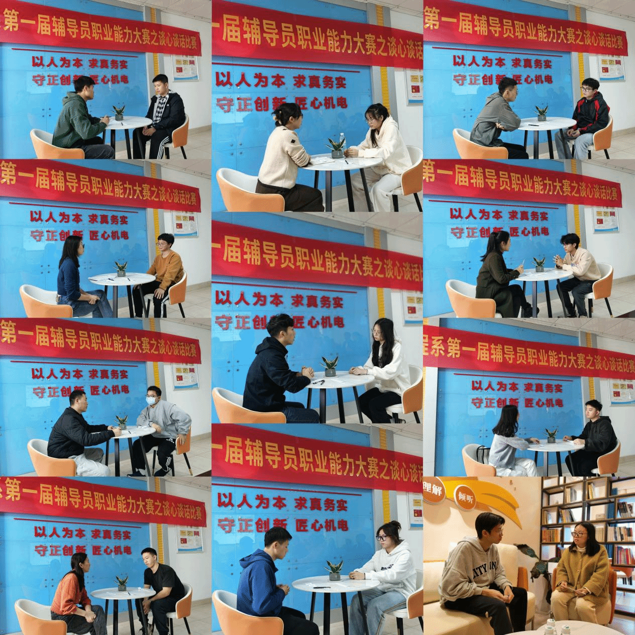 本次大赛旨在全面提高我院辅导员的职业素养和工作能力,展现新时代辅导员的风采。要求辅导员与学生两两组队,面对面交流,针对学生提出的生活与学习方面的疑惑,积极应对,旨在提高我院辅导员对待青年大学生的亲和力和沟通能力。