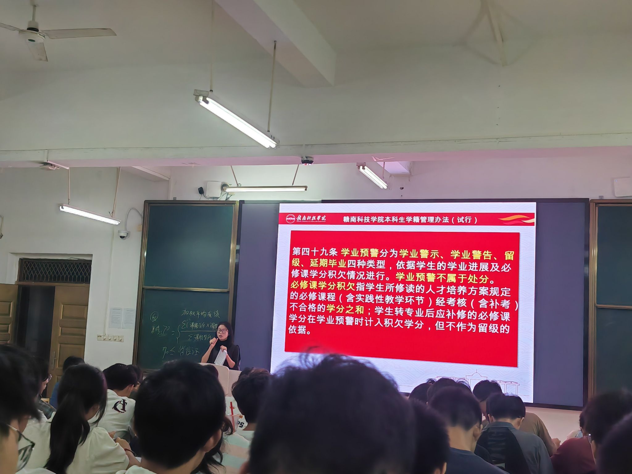 会议开始,辅导员吴欣老师从学生管理规定的制定背景和目的入手,介绍了学籍管理、奖学金评定、纪律处分、行为规范等几大核心内容。她强调:“学生管理规定不仅是对大家行为的约束,更是为学生提供支持和保护的制度保障。”随后,她结合常见的违纪案例,如迟到旷课、学术不端、寝室安全隐患等,详细讲解了相关条例的具体要求及其重要性,提醒同学们时刻以规则为准绳,树立正确的价值观和行为习惯。