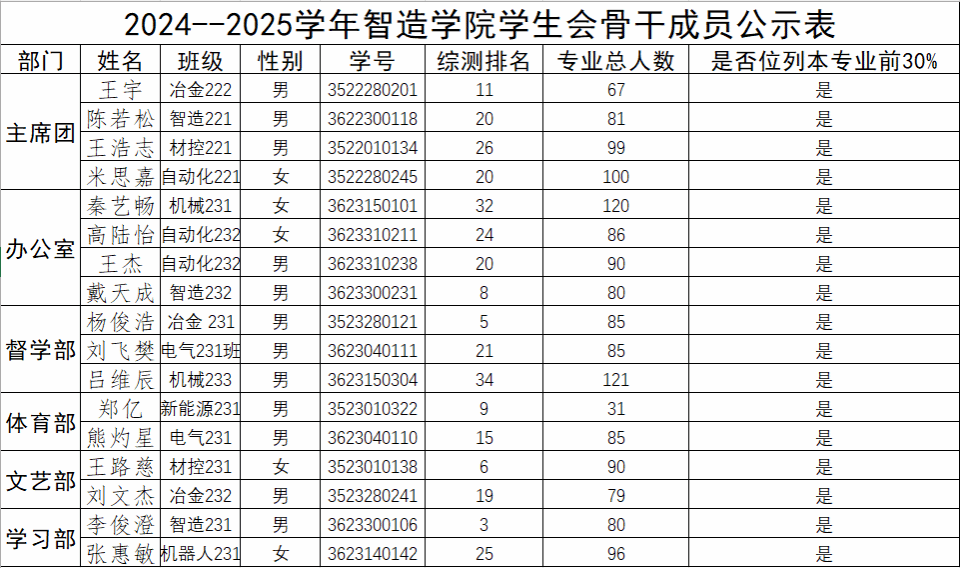 大会秉持着挑选学生会成员思想政治素质高、学习成绩优良,无课业不及格情况,且综 合成绩排名位列专业前 30%,下方是智能制造与材料工程学院学生会主席团及学生骨干的基本信息和成绩。
