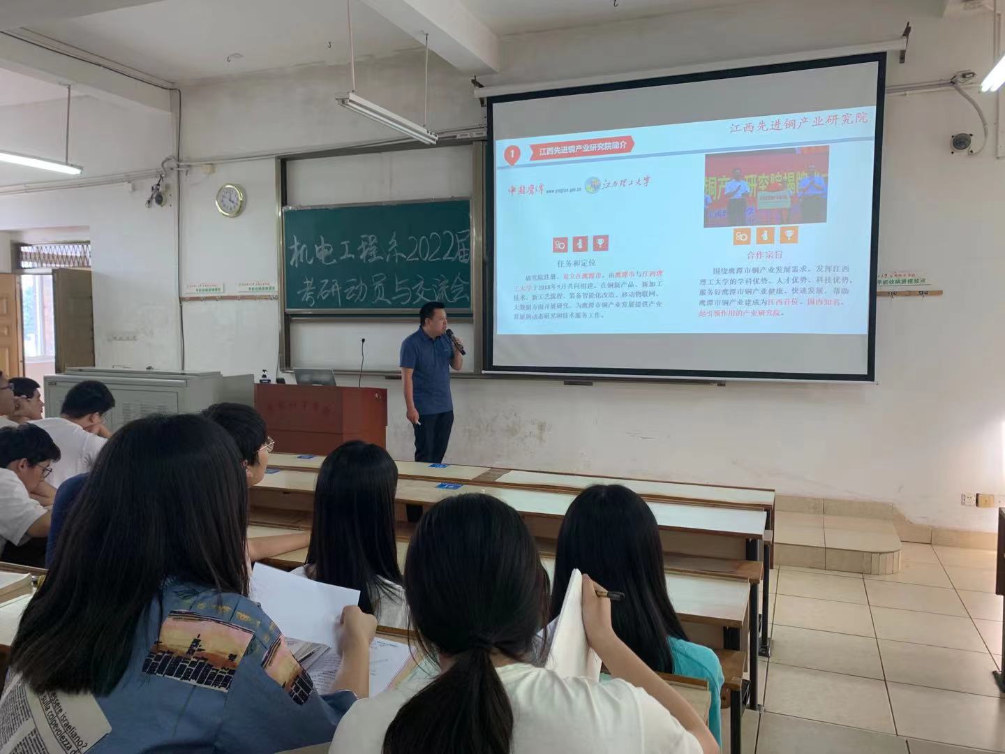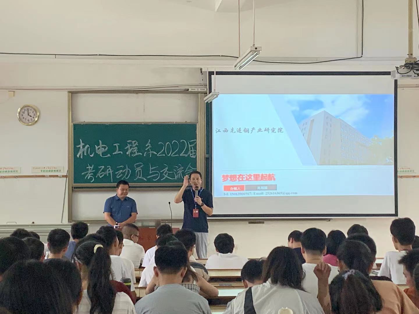 江西先进铜产业研究院副院长肖翔鹏、永磁磁浮技术与轨道交通研究院邓永芳博士分别介绍了研究院的相关情况,并从研究院的师资情况、研究领域、科研成果、招生政策和奖学金项目等多角度分析了专业优势,激励大家要认真对待,积极备考,争取深造机会,并鼓励学生报考本校研究生。