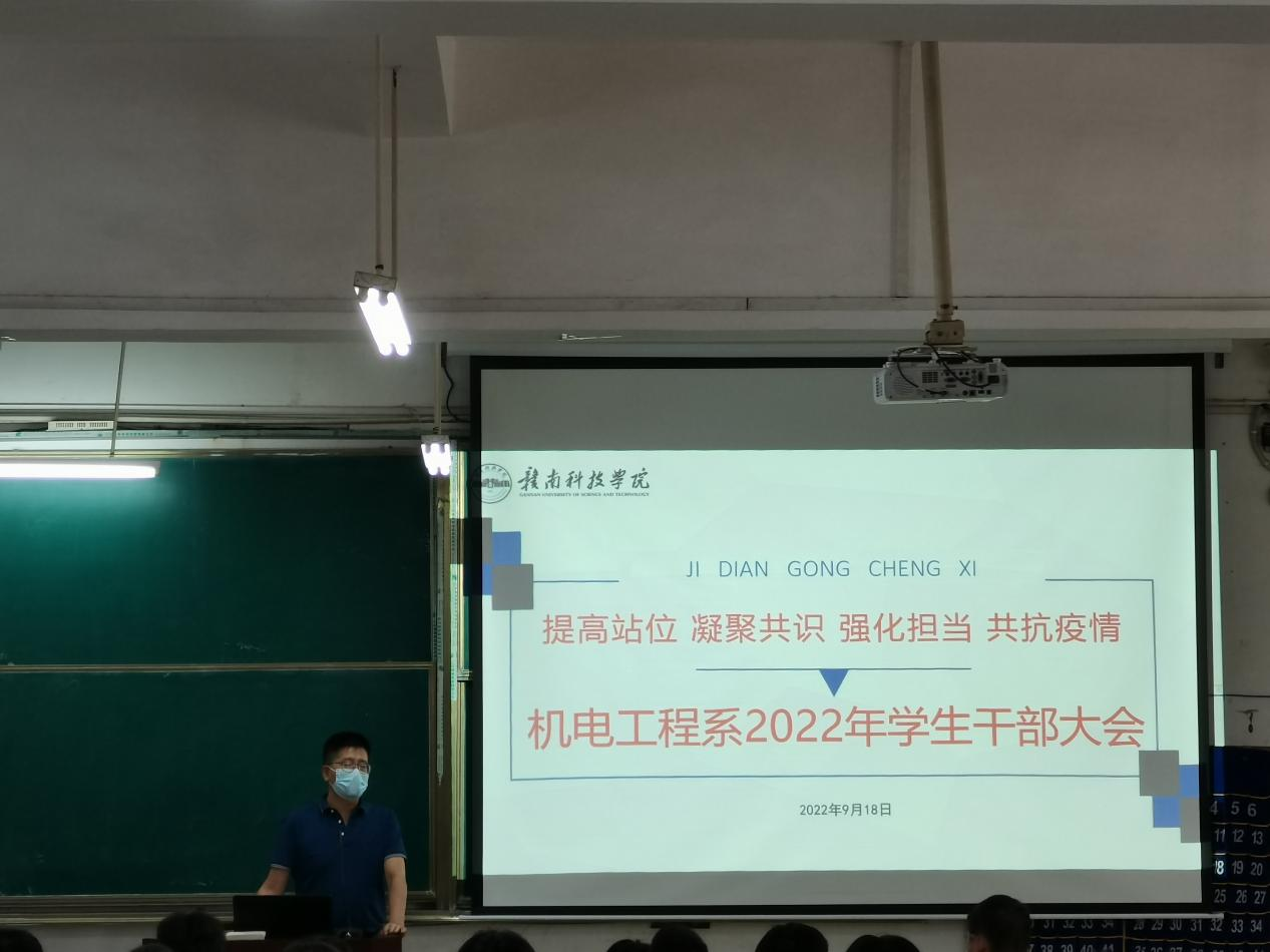 本网讯:9月18日下午,机电工程系在主教Z1D1召开全体学生干部大会,会议由肖志华老师主持,校过渡期委员会委员付玉华、系主任刘辉、辅导员以及各年级学生干部参加了此次会议。