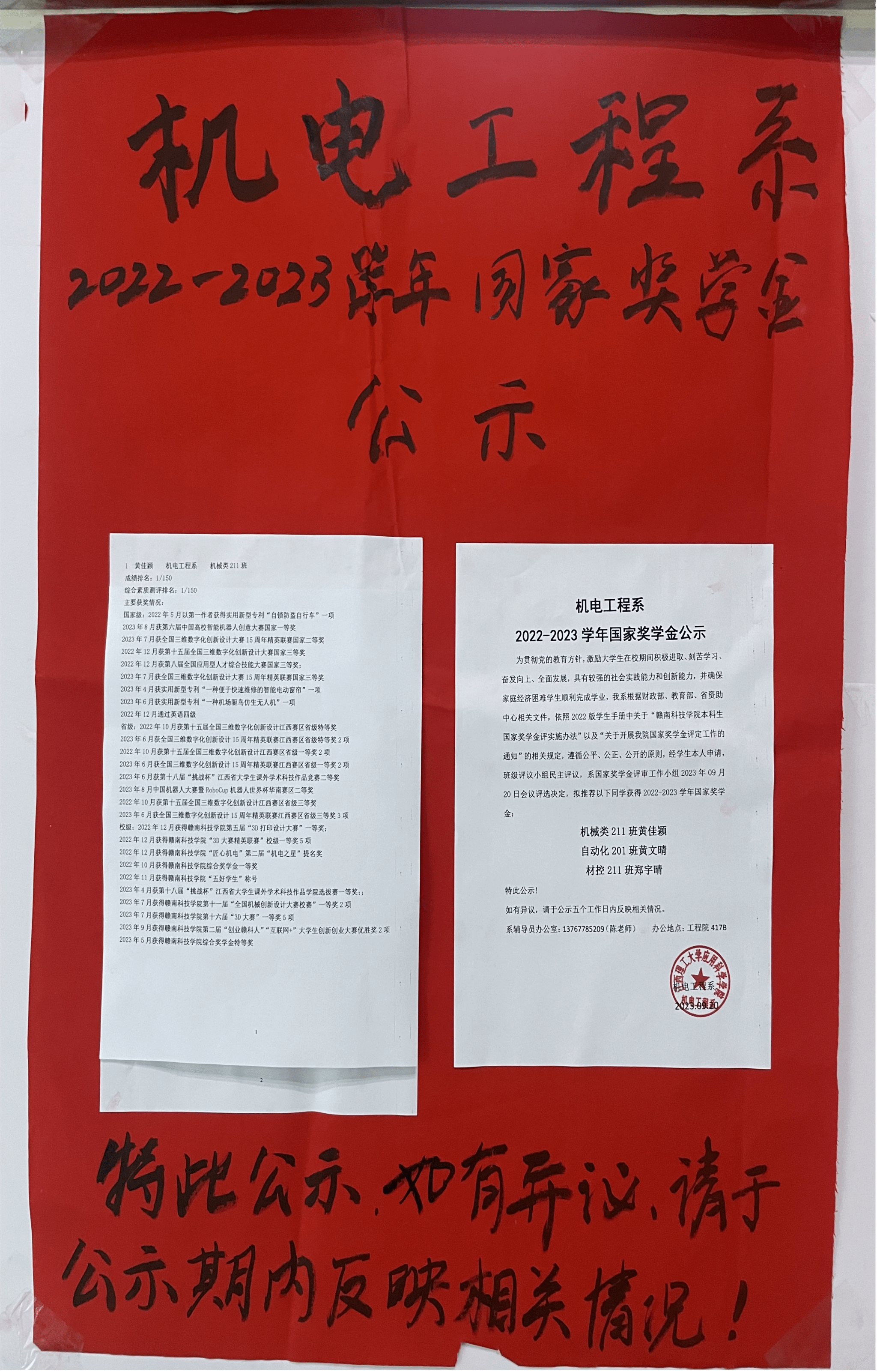 根据财政部、教育部、省资助中心相关文件,依照2022版学生手册中关于“赣南科技学院本科生国家奖学金评实施办法”以及“关于开展我院国家奖学金评定工作的通知”的相关规定,遵循公平、公正、公开的原则,经学生本人申请,班级评议小组民主评议,系国家奖学金评审工作小组2023年09月20日会议评选决定,拟推荐以下同学获得2022-2023学年国家奖学金: