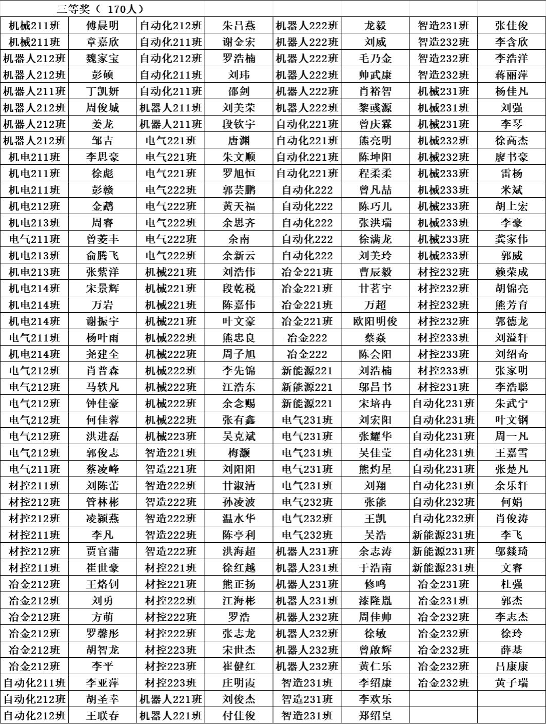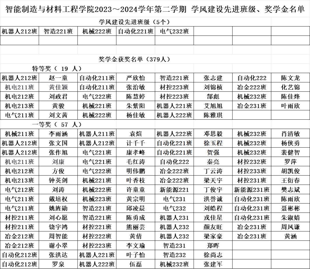 根据学校《关于做好2023-2024学年第二学期学生综合素质测评及学生综合奖学金评定工作的通知》文件要求,按照《智能制造与材料工程学院学生综合素质测评评定补充细则》有关规定,经学生本人申请、班级认定评议小组评议、学院认定评审领导小组审定,拟确定机器人212等5个班级获得学风建设先进班级称号,赵一童等379名学生获得综合奖学金。现予以公示,公示期为:2024年10月22日到10月24日,公示三天。如有异议,请在公示期内与学院反映。