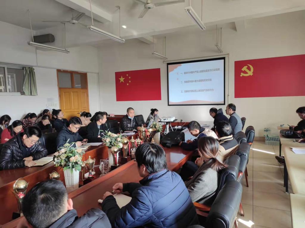 12月14日下午,机电工程系党总支书记朱根松在崇善楼8楼党员活动室为全体教职工上党课,宣讲党的十九届六中全会精神。