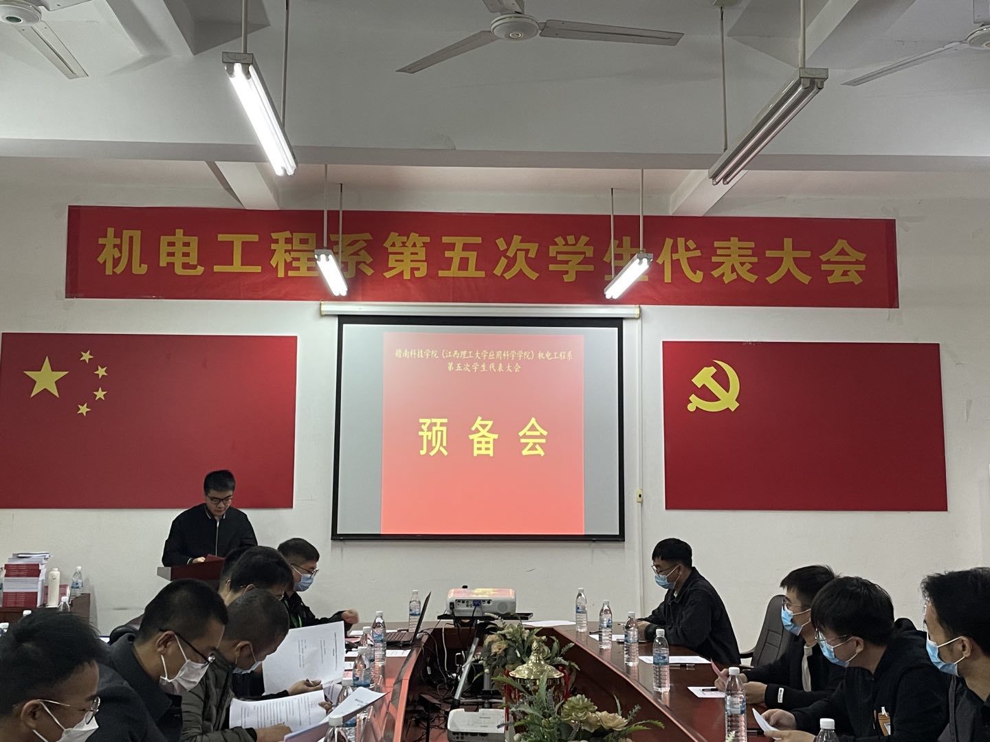 首先举行预备会议,预备会议流程为:一、听取和审议《赣南科技学院(江西理工大学应用科学学院)机电工程系第五次学生代表大会筹备工作报告》二、听取和审议《赣南科技学院(江西理工大学应用科学学院)机电工程系第五次学生代表大会代表资格审查报告》三、通过《赣南科技学院(江西理工大学应用科学学院)机电工程系第五次学生代表大会议程》四、通过大会主席团、秘书长、副秘书长名单五、通过《赣南科技学院(江西理工大学应用科学学院)机电工程系第五次学生代表大会选举办法》六、通过大会总监票人、监票人、计票人名单七、选举赣南科技学院(江西理工大学应用科学学院)机电工程系第五届学生代表大会常任代表正式候选人八、选举参加赣南科技学院(江西理工大学应用科学学院)第四次学生代表大会代表正式候选人