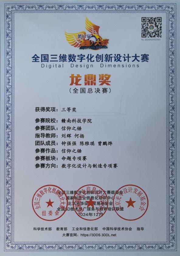 本网讯:12月8日,第十七届全国三维数字化创新设计大赛落下帷幕。在刘辉、唐雨、何扬等老师的指导以及同学们的共同努力下,我校共三支队伍在“数字工业”赛项上荣获国家级三等奖两项,在“3D校园大使”赛道荣获国家级三等奖一项,在“数字化设计与制造”专项赛荣获国家级三等奖一项,共荣获国家级三等奖四项。