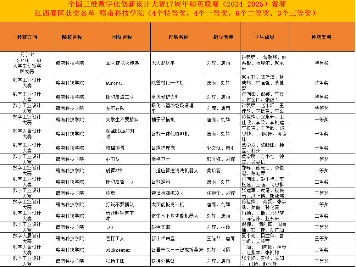 本网讯:6月6日,第十七届全国三维数字化创新设计大赛省赛圆满落幕。我校智能制造与材料工程学院的学子们凭借出色的表现以及多位带队老师的悉心的指导,在激烈的竞争中脱颖而出,荣获特等奖四项、一等奖四项、二等奖六项和三等奖三项的优异成绩,充分展现了我校学子的创新实力与团队精神。