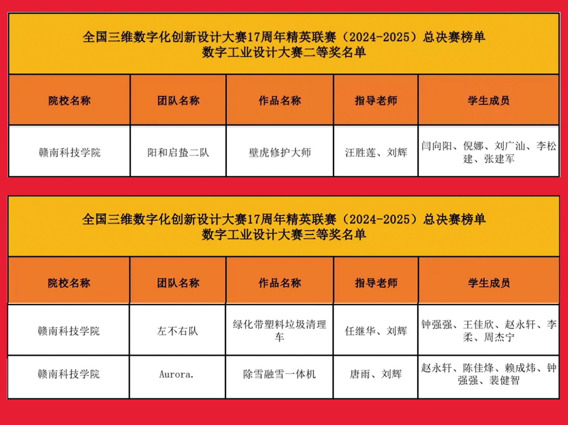 本网讯:2025年7月12日第十七届全国三维数字化创新化设计大赛精英联赛(以下简称“精英联赛”)落下帷幕。在刘辉、唐雨等老师的指导以及同学们的共同努力下我校智能制造与工程材料学院共三支队伍参加精英联赛国赛,其中一支队伍获得国家级二等奖,两支队伍获得国家级三等奖。