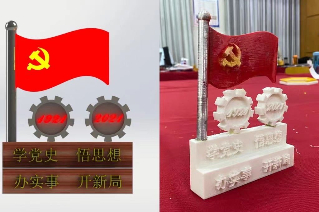 机械201班徐佳仪她所设计的《党的100周年旗帜》作品,更是把专业与红色精神相结合,用机械专业重要传动零部件来表示100数字,两个数字“〇”创新性用两个齿轮表示,前面的党的旗帜代表数字“1”用轴来表达,体现了中国制造向中国创造升级,为中国共产党建党100周年献礼。
