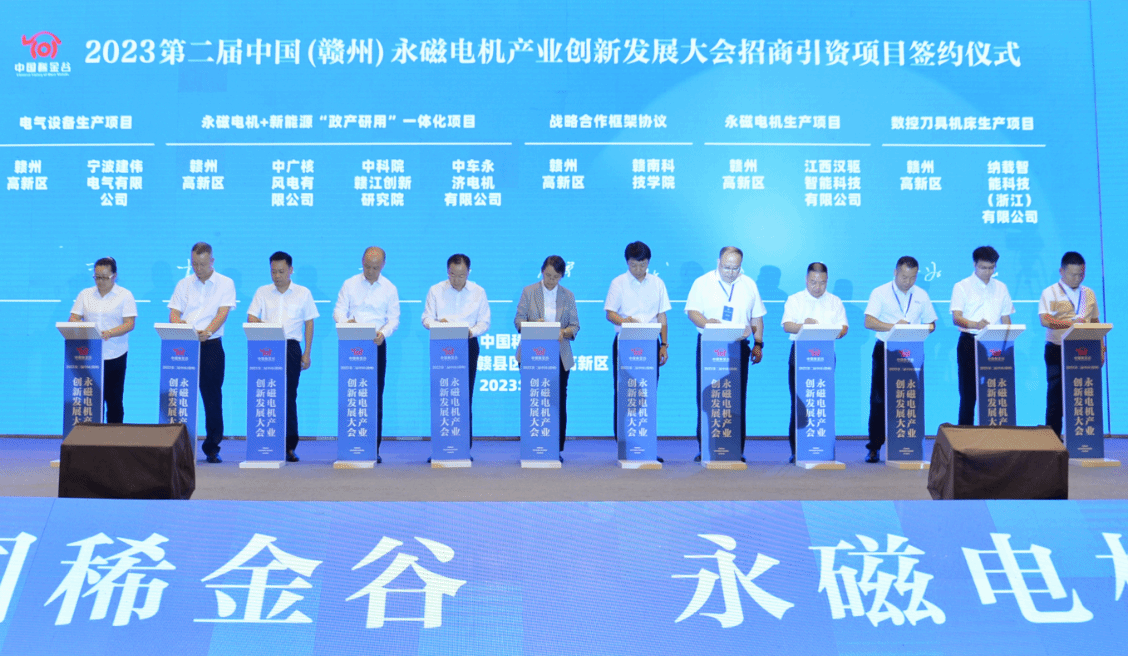 本网讯:8月19日,我校与赣县区人民政府/赣州高新区管委会合作框架协议签约仪式,在2023第二届中国(赣州)永磁电机产业创新发展大会上举行,副校长左群与赣县区委副书记、区长、赣州高新区党工委副书记、管委会主任刘文彦分别代表双方签约。