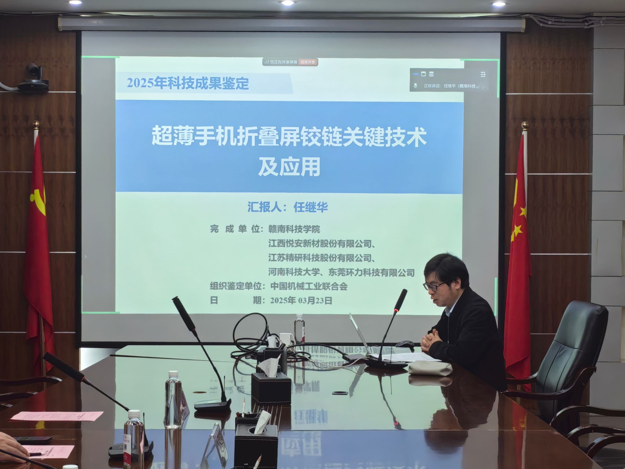 本网讯:3月23日,中国机械工业联合会线上召开“超薄手机折叠屏铰链关键技术及应用”项目科技成果(完成单位:赣南科技学院)鉴定会。来自北京航空航天大学、大连理工大学等单位的7名专家组成员,对由我校牵头,江西悦安新材、江苏精研、河南科技大学等单位共同完成的这一科技成果进行权威评估。学校党委委员、副校长何锦龙,智能制造与材料工程学院相关负责人及项目组成员在崇善楼第一会议室参会。会议由中机联科技工作部牛芳处长主持。