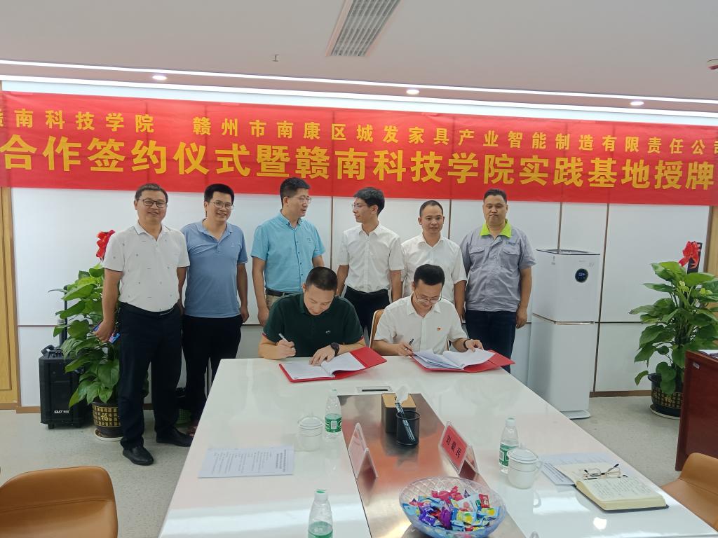 双方举行了签约与授牌仪式,付玉华为城发家具产业智能制造有限责任公司授牌“赣南科技学院实践基地”,刘辉与王隆平双方代表签订了《校企合作协议》。