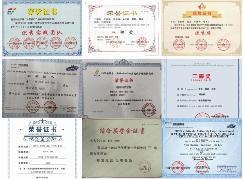 在校期间,黄焱曾获得校级一等、三等奖学金多次及普通话二乙资格证书;发表过三篇中青校园;获优秀团员荣誉称号;荣获第八届全国高校BIM毕业设计创新大赛二等奖、第十四届全国大学生电工数学建模竞赛二等奖等奖项。