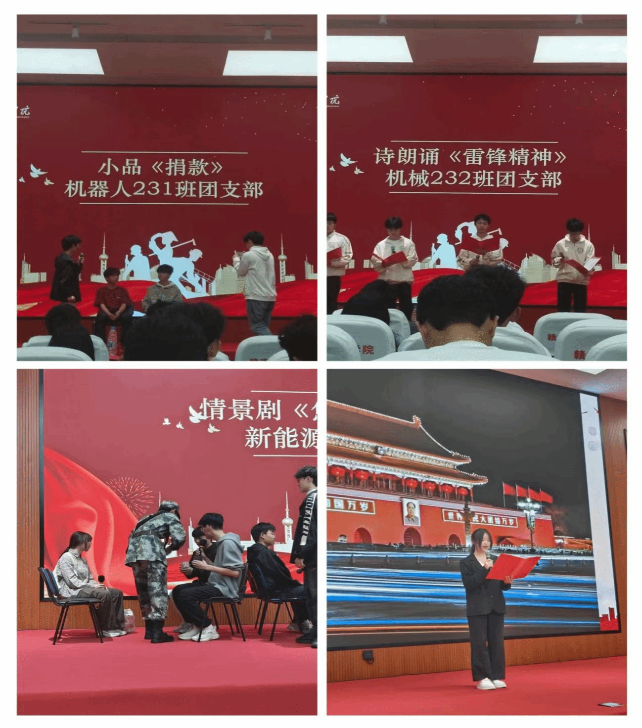 话剧《以雷锋之精神,实现中华民族之复兴》生动形象表演和真挚的情感向观众展现了灾难来临,新时代青年迎难而上,不断前行;朗诵《雷锋故事》,给我们分享雷锋的生平事迹,呼吁青年在新的时代赓续雷锋精神,传承雷锋精神;情景剧《您好,雷锋叔叔》用一幕幕平凡普通的历史场景,再现“雷锋出差一公里,好事做了一火车”;小品《捐款》以贴近大学生平常生活的表演,悄然揭示着雷锋精神的历久弥新。