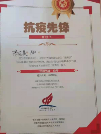 汽服181班的荆琨同学家住吉林省白山市长白朝鲜族自治县八道沟镇。由于疫情的影响不能外出,当地防控第一天,其母亲主动作为志愿者去当地防控点值班,荆琨同学受母亲影响,志愿加入防疫第一线,与母亲一起并肩作战,劝诫村民不要聚餐,不要乱走动,并且随时做好往来人员的信息登记,保证居民的安全。