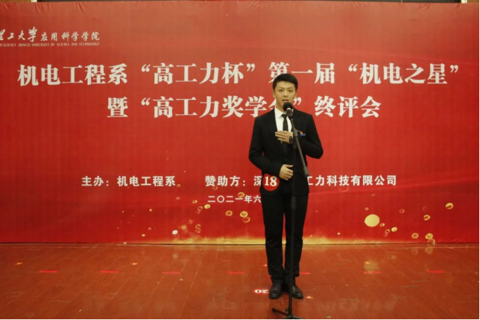 深圳市高工力科技有限公司副总经理黄羽,江西理工大学应用科学学院院长何锦龙,为机电之星获得者颁奖