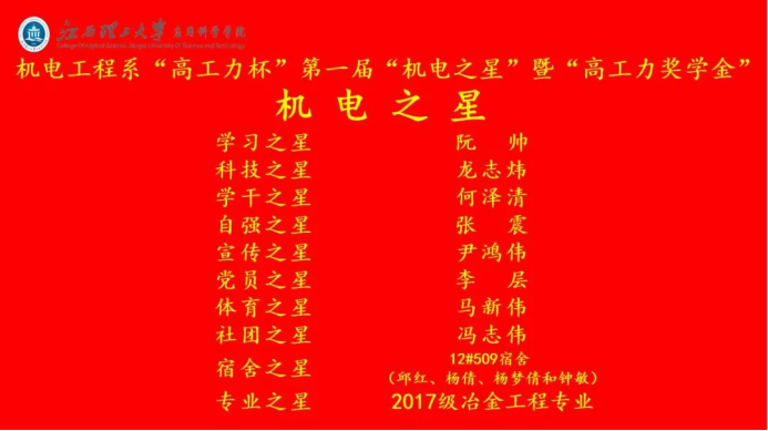 喜迎建党100周年,我院建院20周年,充分展示我系优秀学子风采,发挥先进典型的榜样示范作用,用先进典型感召、激励广大青年学子,引导广大学子勤奋学习、勇于实践、敢于创新、积极进取,2021年6月1日,我系在图书馆报告厅隆重举行江西理工大学应用科学学院“高工力杯”第一届“机电之星”暨“高工力奖学金”终评会。