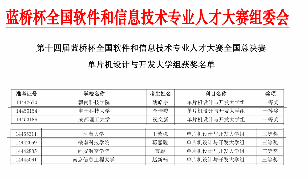 赣南科技学院学子电气201班姚皓宇和机械204班葛嘉骏参加了南昌大学赛点单片机设计与开发大学组的决赛,并荣获一等奖1项,三等奖1项的优异成绩,其中姚皓宇同学获得一等奖第一名,取得我校在该赛事新的突破。成绩的取得是学生平时刻苦训练的成果,这其中也凝聚了指导老师们的心血。通过参加该项赛事,学生获得很好的锻炼机会,增强了创新思维、实践经验并且提高了嵌入式开发设计能力。
